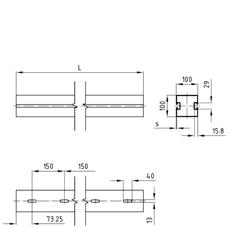 MU-131608 MPT-Montageskinne Q100/2,5mm 6.000 mm, 2SL. Varmgalvaniseret60002.5 CAD/Step