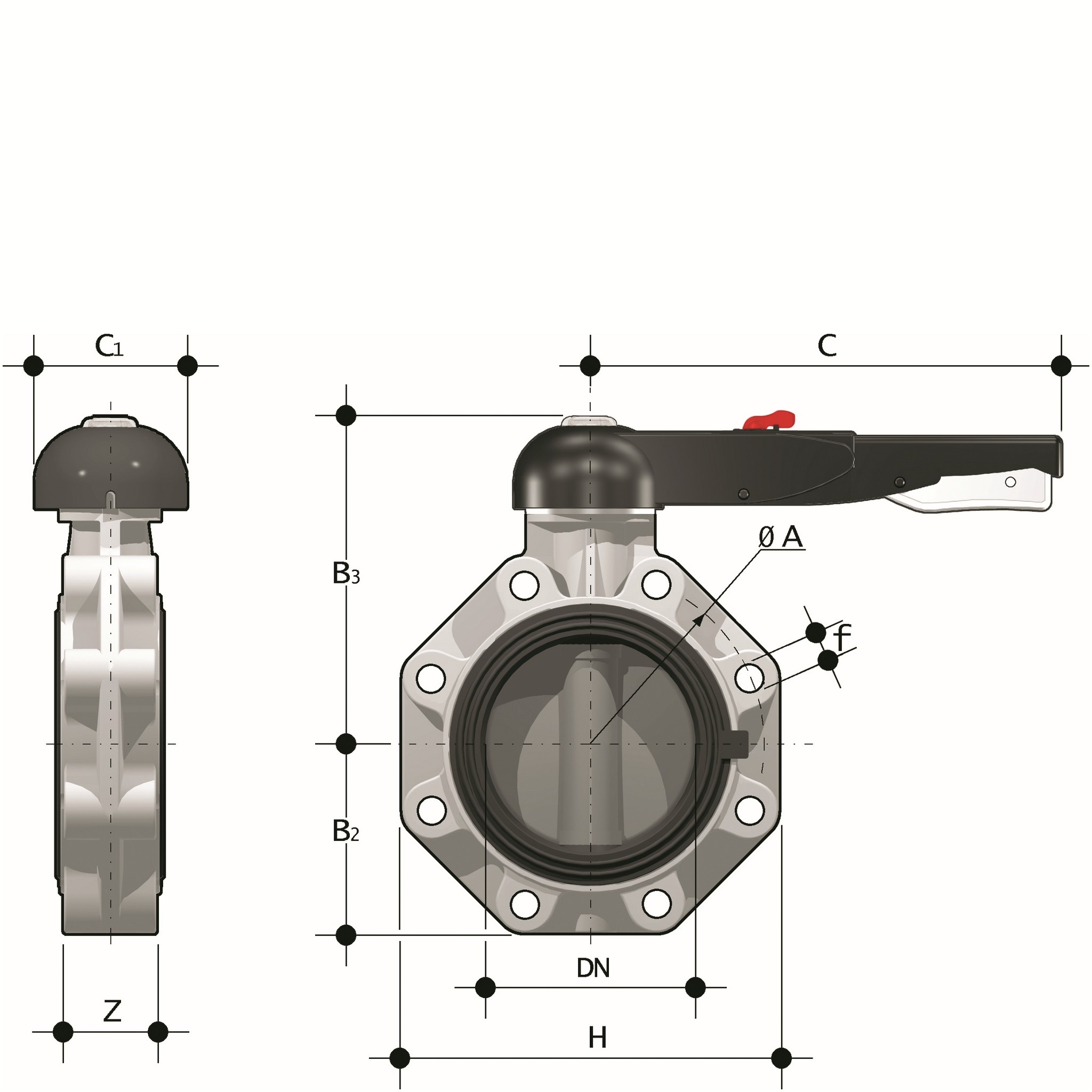 PP Butterflyventil med håndtag DN40-200 FPM