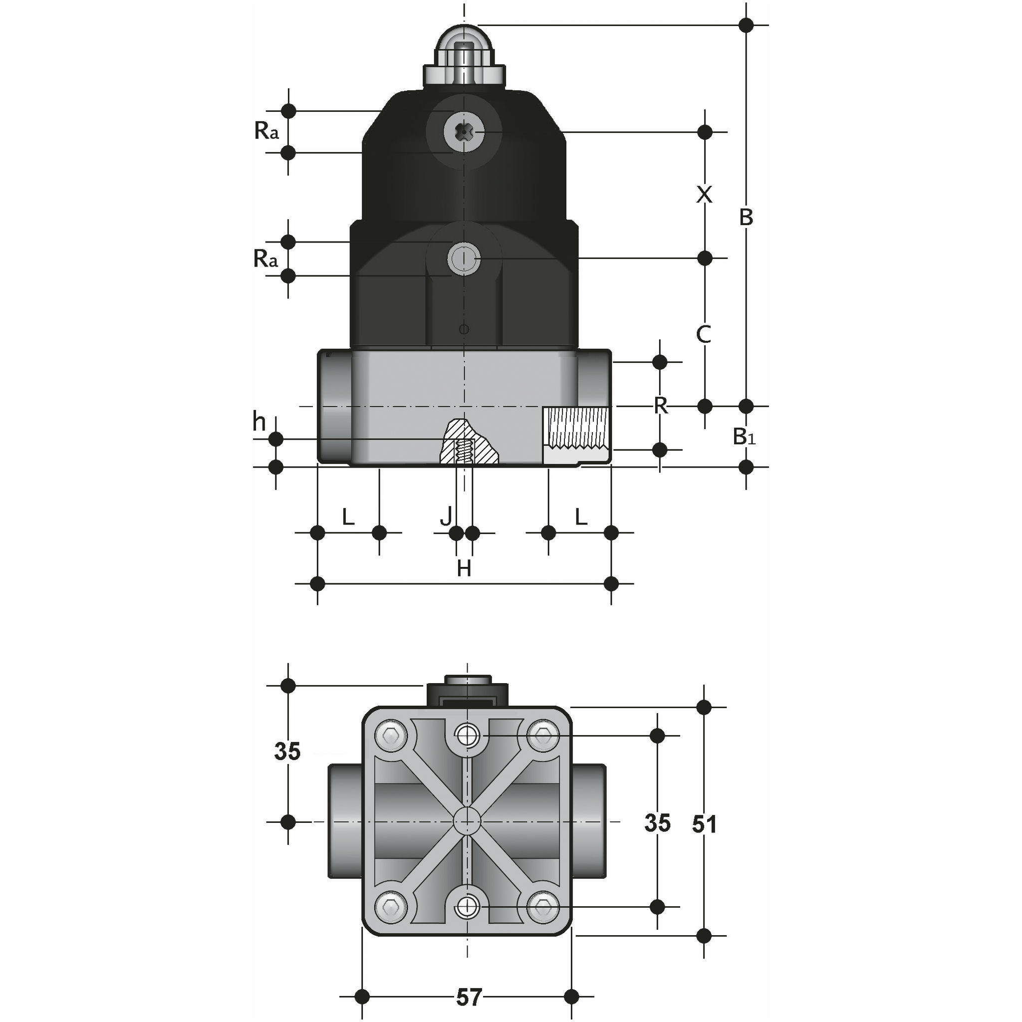 PVC-U Membranventil, indvendig gevind, pneumatisk (DA) DN12-15 EPDM