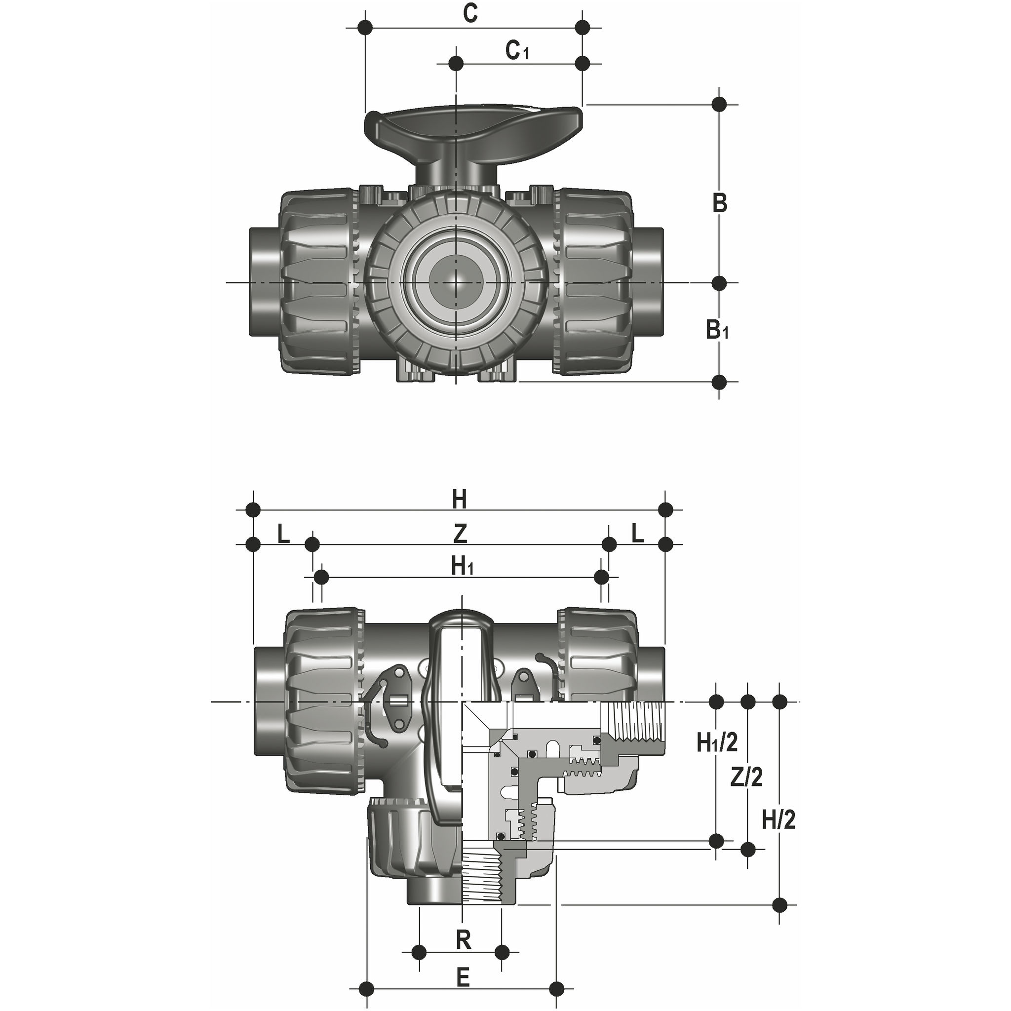 PVC-U 3-vejs Kugleventil indvendig gevind, L-boret DN10-50mm EPDM